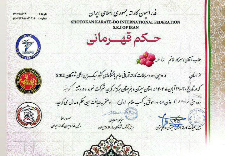 خانم فاطمه؛ رده سنی نونهالان، وزن ۵۵ کیلوگرم، مقام اول